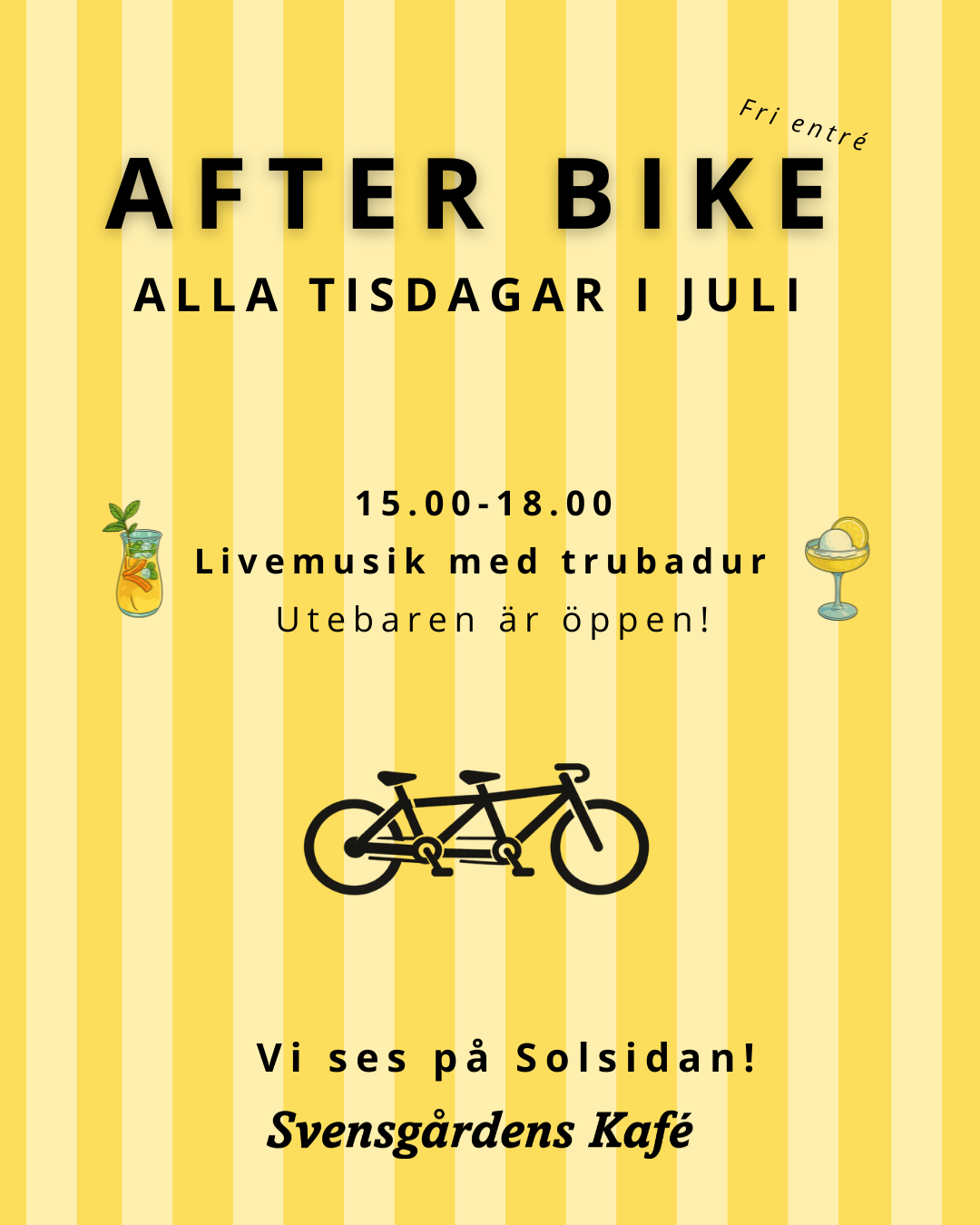 Här hittar du alla våra evenemang utöver våra ordinarie öppettider. Allt från Abba Party till After Bike och andra roliga och välbesökta evenemang. Hittar du och ni något intressant som ni vill medverka på eller i så glöm inte att boka plats. After Bike är det bara att besöka utan anmälan. Välkomna!